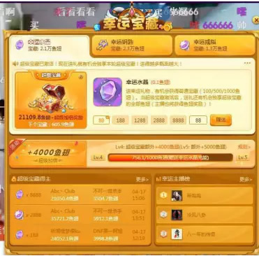 “幸运宝藏”奖品分两种,一种是普通宝藏,最高中奖额度高达1000鱼翅,价值1000元人民币,另一种为超级宝藏,最高中奖额度高达50000鱼翅,价值人民币5万元。