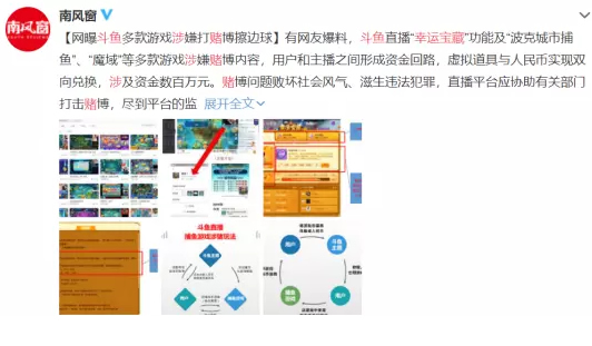 近日,多名微博爆料斗鱼直播“幸运宝藏”功能等多款游戏涉嫌赌博,用户与主播之间形成完整的资金回路,虚拟货币与人民币实现双向兑换,单月开奖金额超800万。