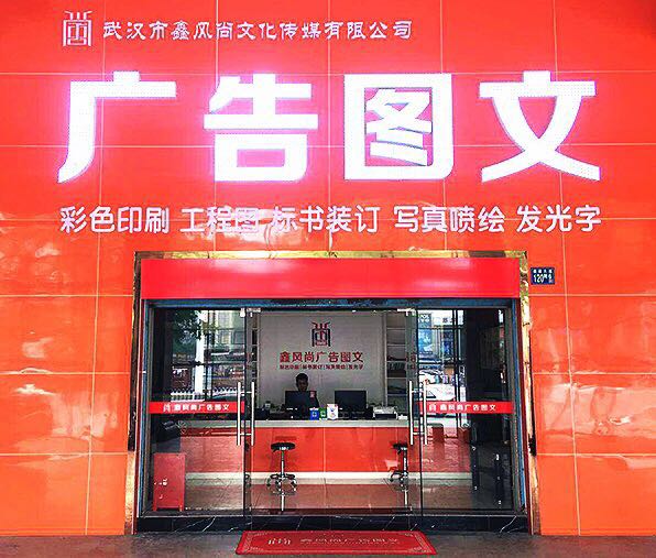 在武汉市宗关有一家叫鑫风尚广告图文的公司,主要经营彩色、黑白快印;工程图;白图、激光蓝图;写真;喷绘;标书印装;发光字等。